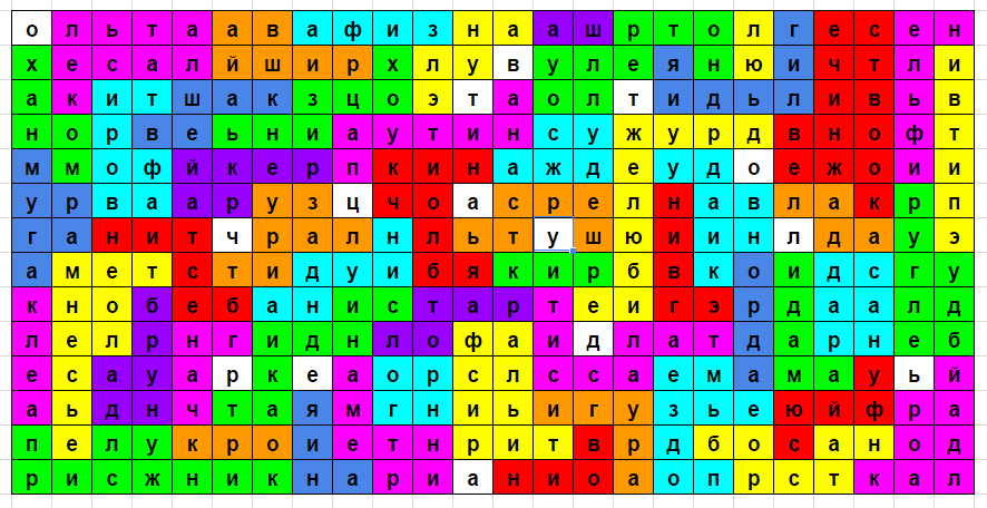 Этап 38: здесь спрятано 54 слова. Слова не пересекаются и ломаются только под прямым углом. Так же здесь спрятано ключевое слово/словосочетание - буквы разбросаны по всему филворду.